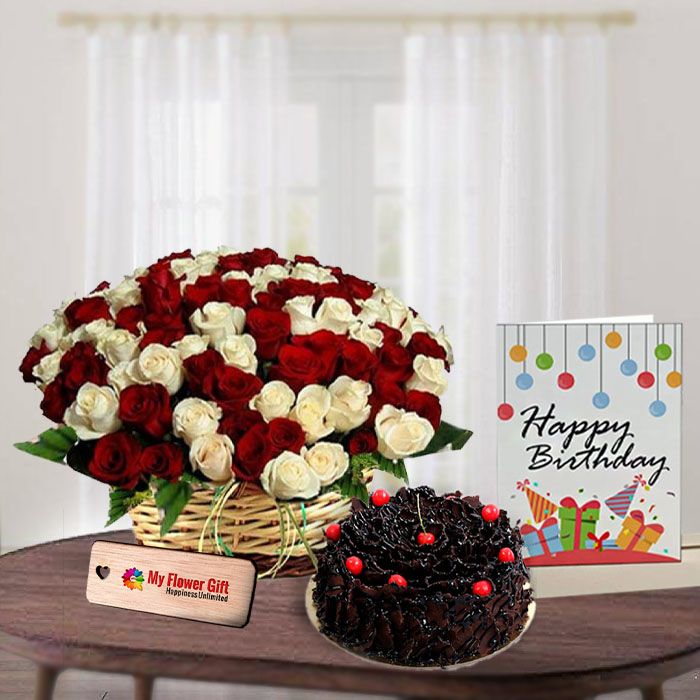 50 red and white roses basket arrangement with 1 kg chocolate fantasy cake with birthday card
