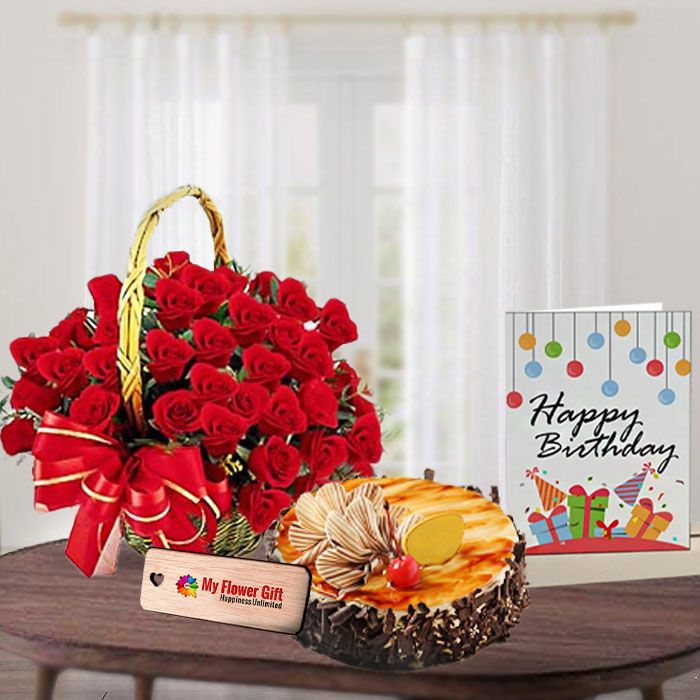 Basket Arrangement of 30 red roses with half kg irish coffee cake with birthday greeting card