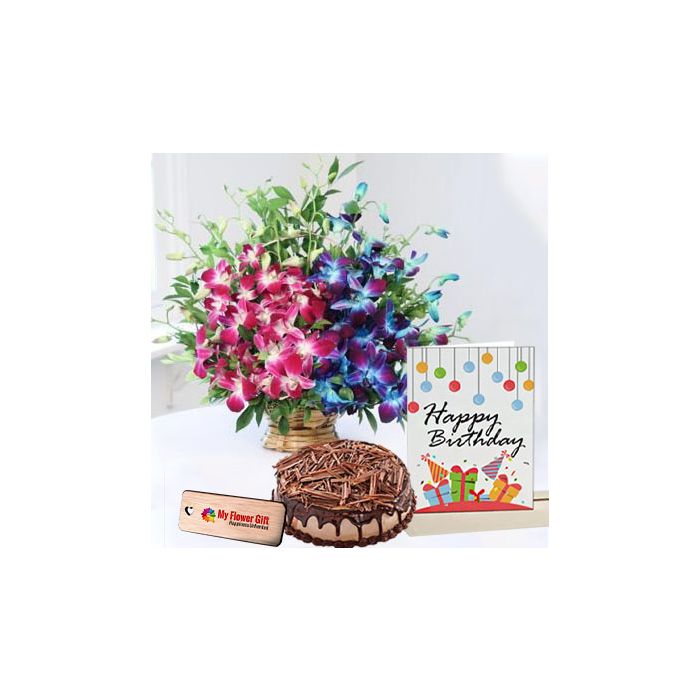 Exotic Basket arrangement of blue and lavender orchids with half kg chocolate cheese cake with birthday greeting card