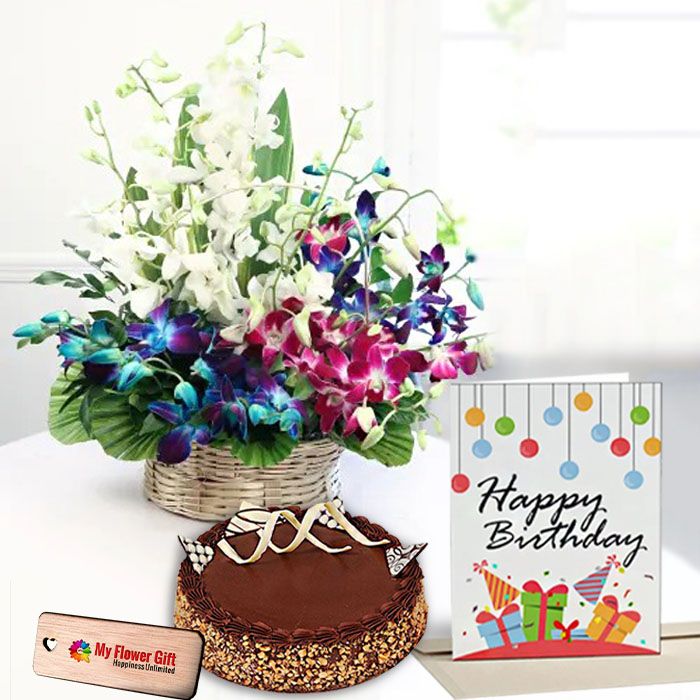 Beautiful Basket arrangement of mix colour orchids with half kg chocolate walnt cake with birthday card