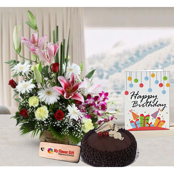 Exclusive basket arrangement of exotic mix flowers, 1 kg chocolate truffle cake with birthday card