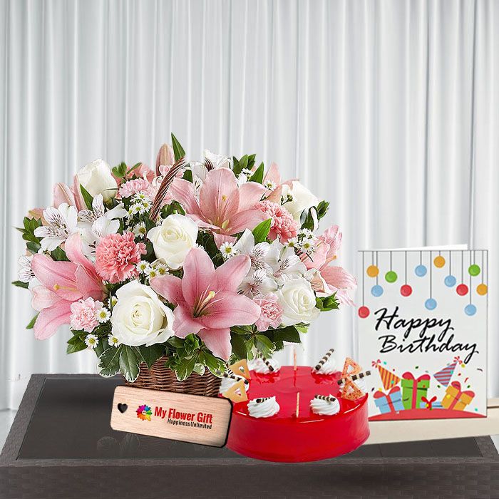 Exotic basket Arrangement of 15 mix flowers with Half kg red velvet cake with birthday card