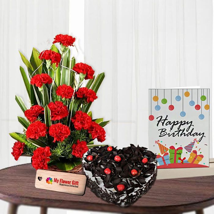 Welcome to our online store! This is the perfect place to find the perfect gift for that special someone in your life. We offer a wide selection of beautiful flowers, delicious cakes, and other delectable treats that are sure to make their day.Our 20 red carnations basket with 1 kg black Forest heart shape cake is the perfect way to show your loved one how much you care. The basket is overflowed with glorious blooms in a vibrant hue of red, and the cake is a delicious treat that will satisfy even the sweetest tooth. The card that comes with it has a heartfelt message that will make them feel extra special on their birthday.This gift is sure to put a smile on their face and fill
