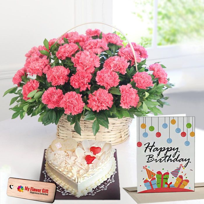 Basket of 20 pink carnations,1 kg heart shape white forest cake,birthday card