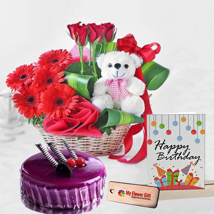 Looking for a special way to show someone you care? Say it with flowers! Our basket arrangement of red gerberas is the perfect way to show your loved ones how much you care. This beautiful arrangement comes with a cuddly teddy bear sitting in it, and is paired with a delicious half kg black currant cake. The perfect way to make someone's birthday extra special!