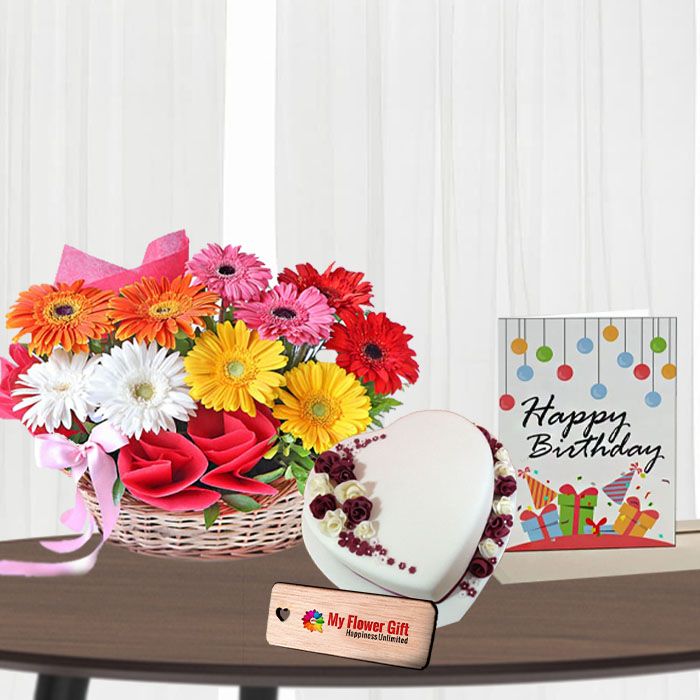 Looking for a beautiful and eye-catching floral arrangement to spruce up your home or office? Then look no further than this stunning mix colour gerbera basket arrangement! This vibrant and fragrant arrangement is perfect for adding a touch of colour and life to any space, and is sure to brighten up anyone's day.The arrangement comes with a 1 kg heart shape premium quality vanilla cake, making it the perfect gift for any special occasion. The cake is delicious and moist, and will be sure to satisfy everyone's sweet tooth. It's also perfect for sharing with friends or family.The greeting card included with the arrangement is the perfect way to say "Happy Birthday", "Congratulations", or "Thank You". So