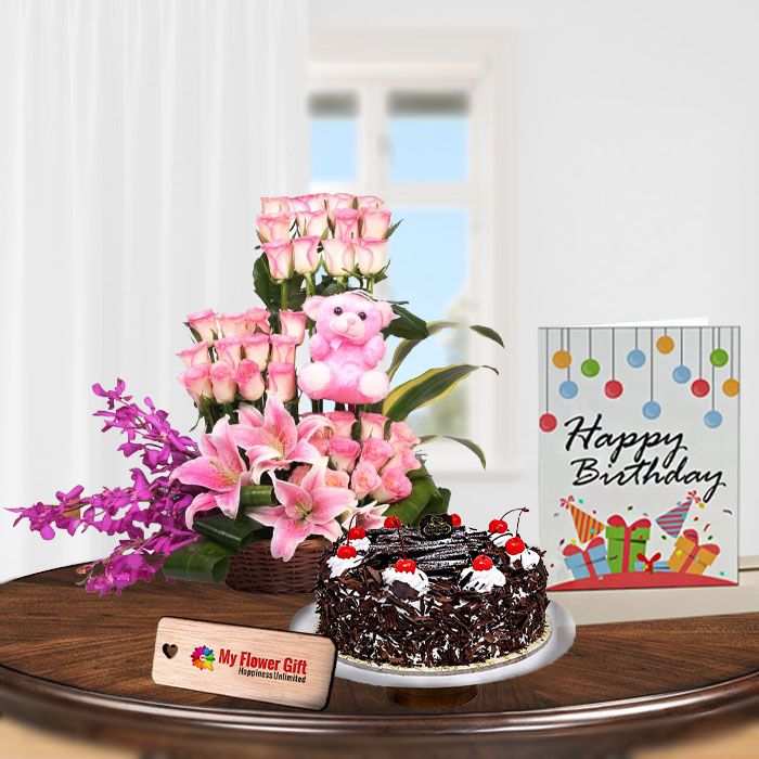 Welcome to our birthday celebration special, where we've got a stunning basket arrangement of pink roses and orchids, with a cute teddybear sitting in it, along with a yummy half kg black forest cake! This is the perfect way to show your loved ones how much you care on their special day!The lovely basket arrangement is filled with beautiful blooms in shades of pink, which are known to symbolize love, appreciation, and admiration. The orchids are a particularly special touch, as they are known for their delicate beauty and luxurious look. The teddybear is the perfect finishing touch to this gift, as it adds a sense of warmth and affection.The delicious black forest cake is made with