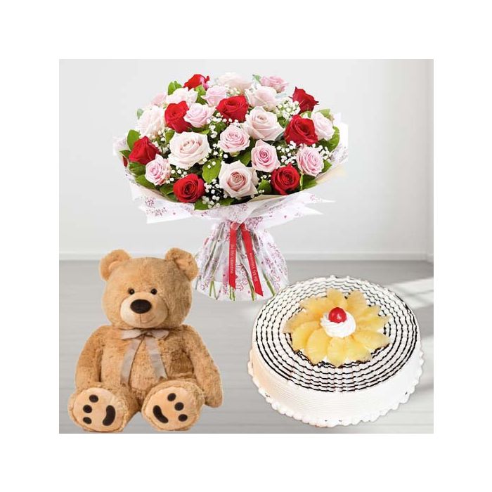 Looking for the perfect way to show your significant other how much you care? Look no further than this stunning bouquet of roses! 20 red and pink roses are expertly arranged with a 6 inch teddybear and pineapple cool cake, making it the perfect gift for any occasion. Whether you're celebrating an anniversary, Valentine's Day, or just showing your appreciation, this gift is sure to impress. The beautiful roses are a symbol of love and appreciation, while the teddybear and cake add an extra touch of sweetness. Order today and make someone special feel loved!