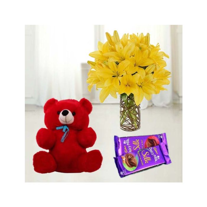 6 yellow lilies in glass vase with 6 inch red teddybear with set of 2 dairy milk chocolates