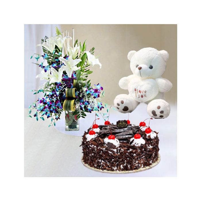 Exotic vase arrangement of blue Orchids with white lilies ,black forest cake with 6 inch teddybear