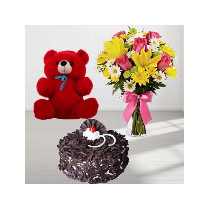 Beautiful vase arrangemnt of 15 mix flowers with premium quality black forest cake with 6 inch teddybear