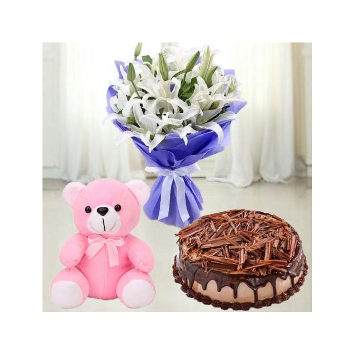 Welcome to our online store! We are excited to offer this beautiful bunch of 5 white lilies with a 6 inch teddybear. This is the perfect gift for someone special in your life! The lilies are fresh and hand-picked, and the teddybear is made of high quality materials. The chocolate cheese cake is delicious and will be loved by everyone! This gift is sure to put a smile on the face of whoever receives it! Thanks for shopping with us!