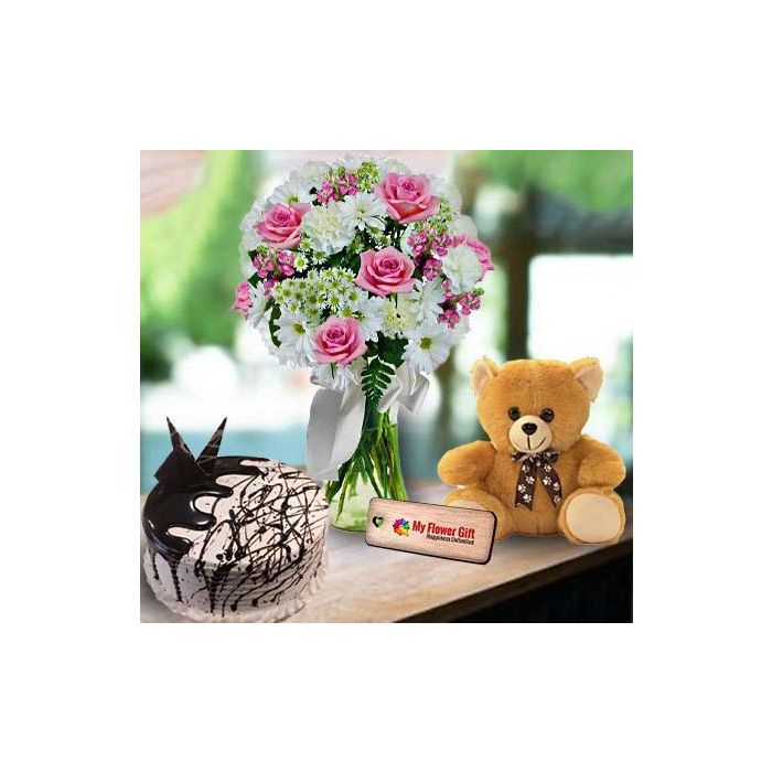 Looking for a romantic and sweet gesture for your loved one? Look no further than this mix of flowers in a glass vase with a 6 inch teddy bear and choco vanilla cake. This beautiful arrangement is the perfect way to show your affection and make any special occasion even more special. The teddy bear is sure to melt their heart, while the delicious cake will satisfy their sweet tooth. So go ahead and surprise your loved one with this lovely gift today!