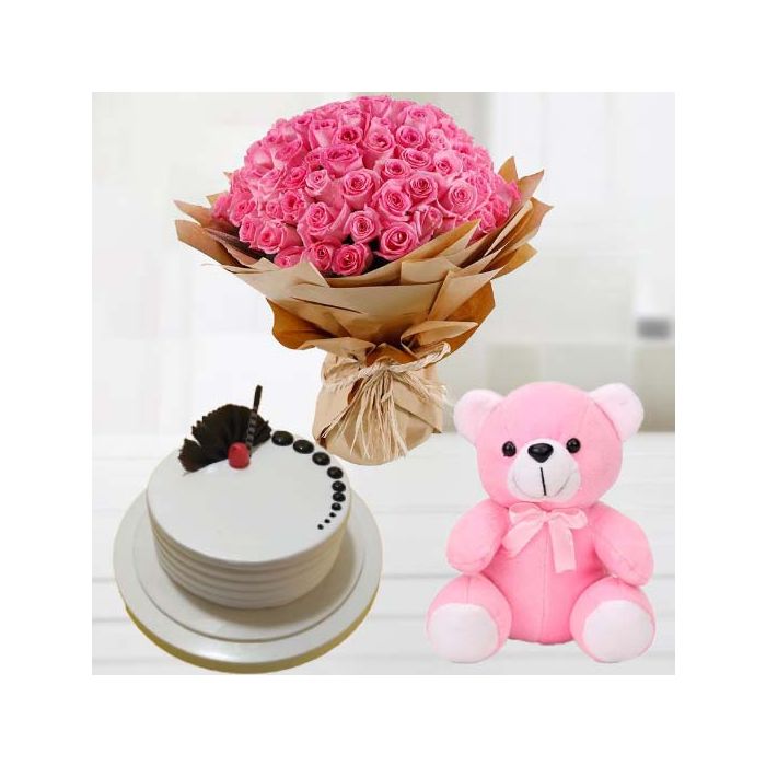50 pink roses bouquet with 6 inch pink teddybear with vanilla cake