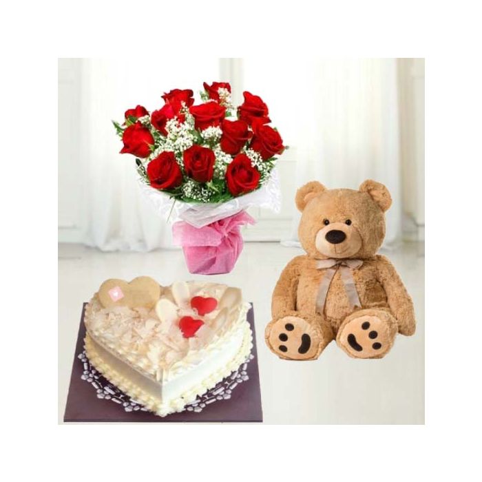 10 red roses bouquet with white forest cake with 6 inch teddybear