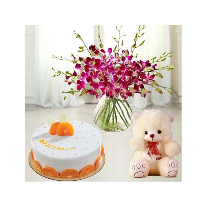 Exotic vase arrangement of 10 lavender ochids with 6 inch teddybear with orange cool cake