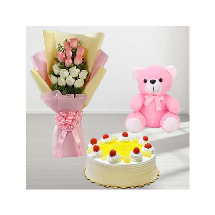Looking for a gift that is both beautiful and delicious? Look no further than this amazing bundle that includes a stunning bunch of 12 pink and white roses, plus a delicious pineapple cool cake with 6 inch pink teddybear. This is sure to be a hit with anyone who receives it! The roses are a symbol of love and appreciation, making this an ideal gift for someone you care about deeply. The pineapple cool cake is not only a tasty treat, but also adds a touch of fun and sweetness to the gift. The 6 inch pink teddybear is the perfect finishing touch to this already amazing present. Whoever is lucky enough to receive this gift will be truly blown away by your thoughtfulness. Order now and make someone