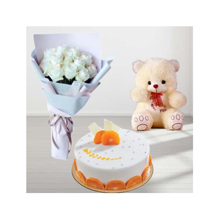 Looking for the perfect way to show your significant other how much you care? Look no further than this stunning bouquet of 12 white roses, accented with a 6-inch teddybear and orange cool cake. The epitome of elegance and grace, this arrangement is sure to take their breath away.
