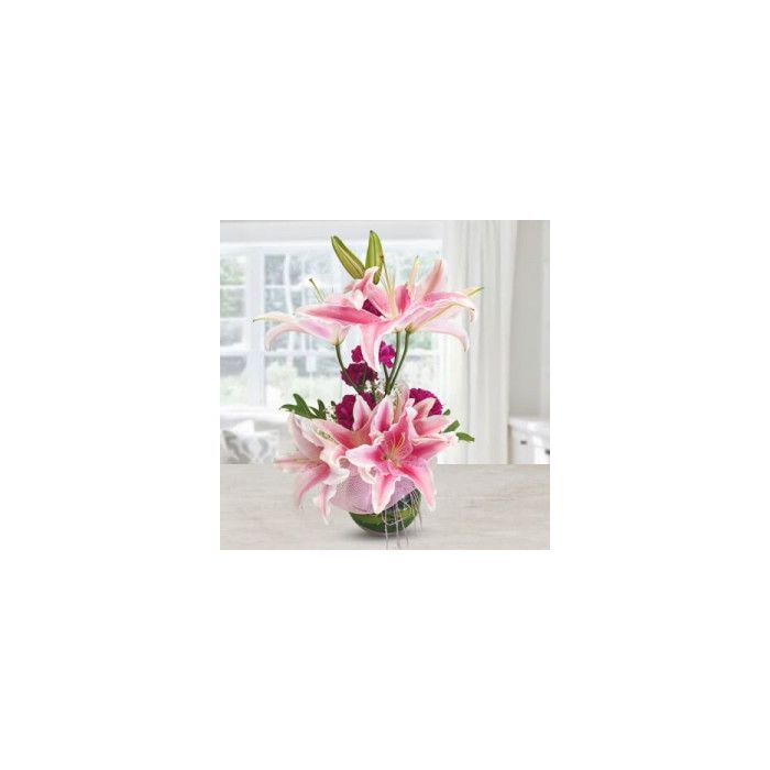 Designer 1 feet height Arrangement of pink lilies with red roses