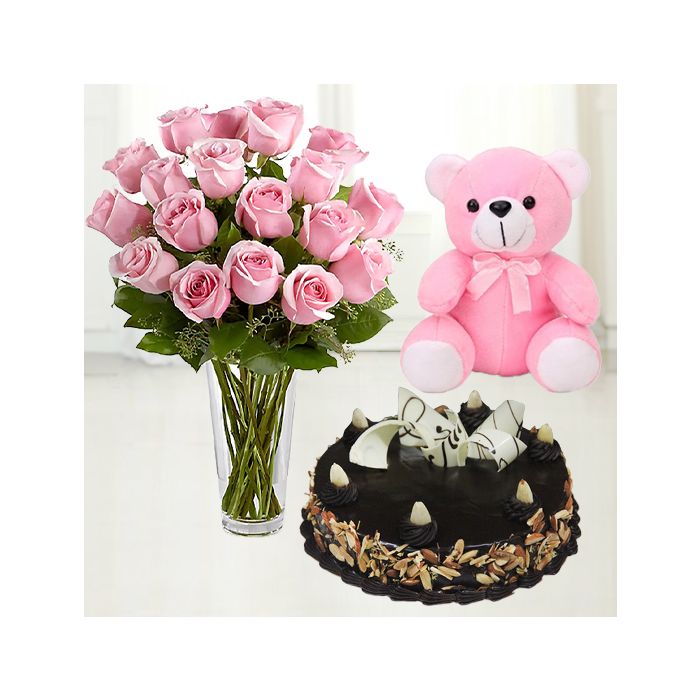 12 pink roses in glass vase with chocolate almond cake with 6 inch height teddybear