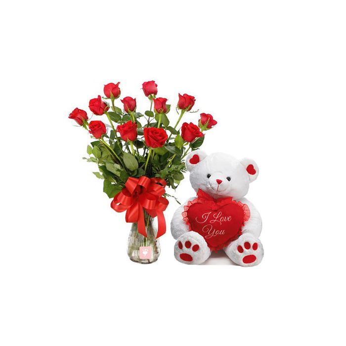 Product Description 1 | first Impression....20 Roses Beautifully Arranged in glass Vase with a cute 6 inch Teddy Bear |