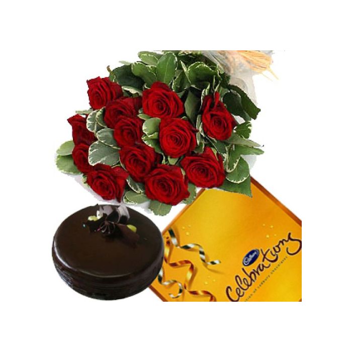 Product Description 1 | Bouquet of 12 red roses with 1 pound chocolate cake & box of celebration |