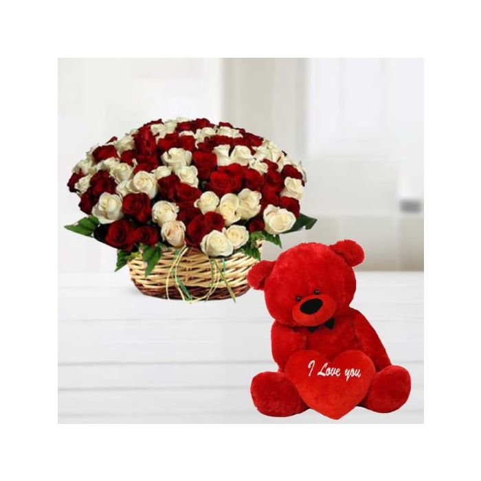 Looking for the perfect way to say "I love you"? Look no further than this beautiful basket arrangement of 50 red and white roses. The perfect mix of romance and elegance, this arrangement is sure to sweep your loved one off their feet. And what's more romantic than a 6 inch red teddy bear? The perfect finishing touch to this already amazing gift.