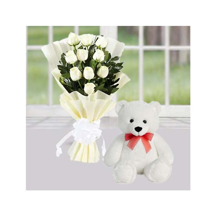 Looking for the perfect way to show your loved one how much you care? Our 12 white roses bouquet with 1 feet height white teddybear is the perfect choice! This stunning bouquet features 12 beautiful white roses, arranged in a stylish vase with a 1 feet height white teddybear. The perfect way to show your affection, this bouquet is sure to take their breath away!