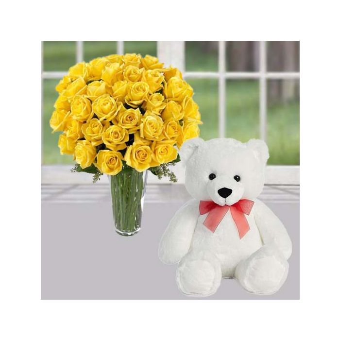 30 yellow roses vase arrangement with a nice 1 feet height teddy bear