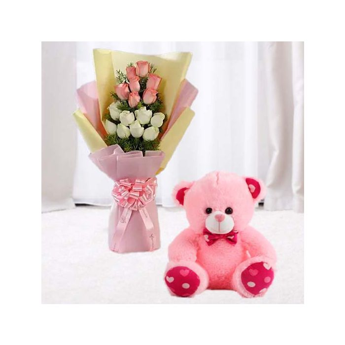 Welcome to our store! We are excited to offer this beautiful bouquet of 10 pink and white roses with a 1-foot-tall teddy bear. This is the perfect gift for any occasion, and we know that you will be thrilled with the results.The roses are a stunning shade of pink, and they are accented perfectly by the white ones. They are all tied together with a pretty ribbon, and they come in a glass vase. The teddy bear is also a special touch, and he is sure to make anyone smile.Thank you for choosing our store, and we know that you will be back for more great products.