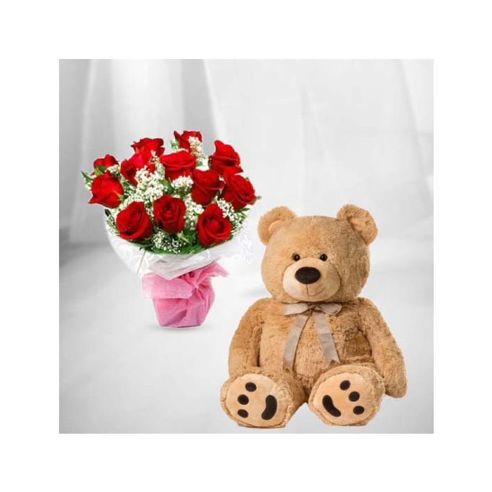 If you are looking for a gift that is sure to make a lasting impression, then look no further than our 50 pink roses bouquet with 1 feet height teddy bear. This stunning arrangement is perfect for anniversaries, birthdays, or any other special occasion, and is sure to put a smile on the face of your loved one.The 50 pink roses are arranged in a beautiful bouquet, and are accented with greens. The teddy bear is also included in the arrangement, adding an extra touch of sweetness. The bear is 1 foot in height, making it a impressive addition to the bouquet.This arrangement is lovingly hand-crafted by our skilled florists, and is delivered fresh to
