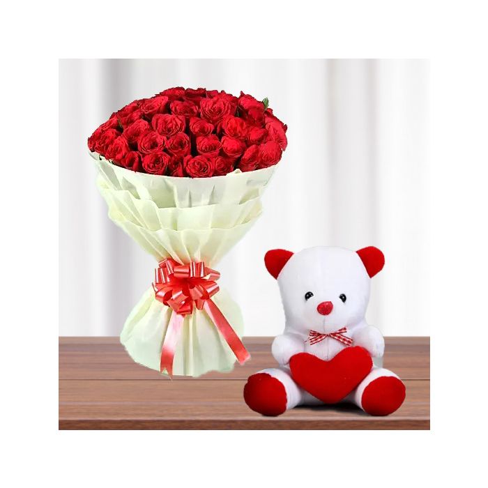 Bouquet of 50 red roses with a cute 1 feet height teddybear