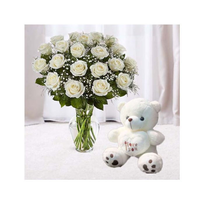 A beautiful bouquet of 12 white roses in a glass vase, with a cute teddy bear peeking out from behind. This is the perfect way to show your loved one how much you care. The teddy bear is 1 foot tall and has a lovely soft fur.