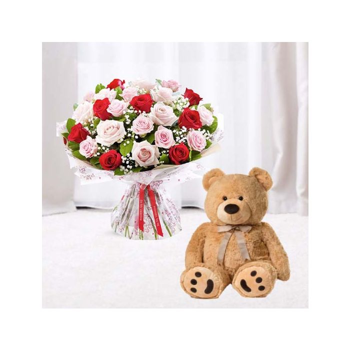 Bouquet of 20 red and pink roses with 1 feet height teddy bear