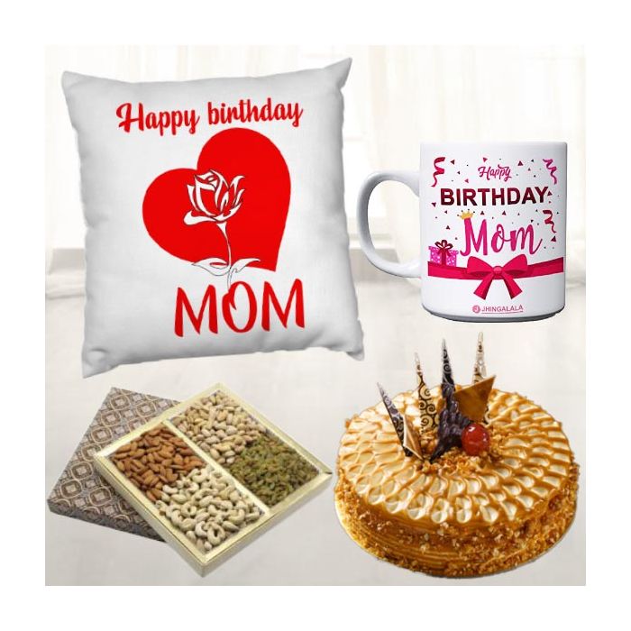 Introducing the half kg assorted dry fruits, photo mug with photo cushion with half kg premium quality butterscotch cool cake! This delicious and healthy treat is perfect for any occasion, large or small. Made with only the finest ingredients, including half kg of assorted dry fruits, this cake is sure to please everyone at your gatherings. And with a custom photo mug and photo cushion, it's the perfect way to show your loved ones how much you care. Order yours today!