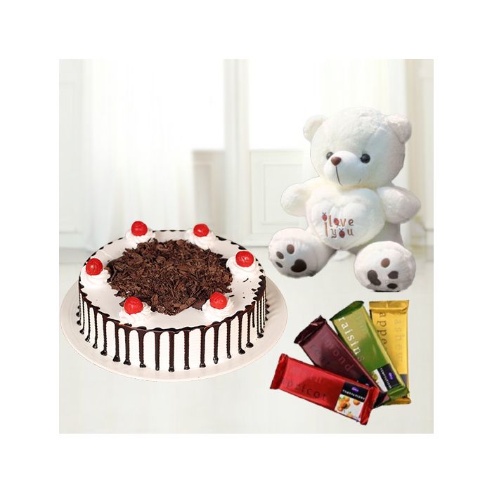 Black forest cake with 1 feet height teddybear with set of 4 temptations