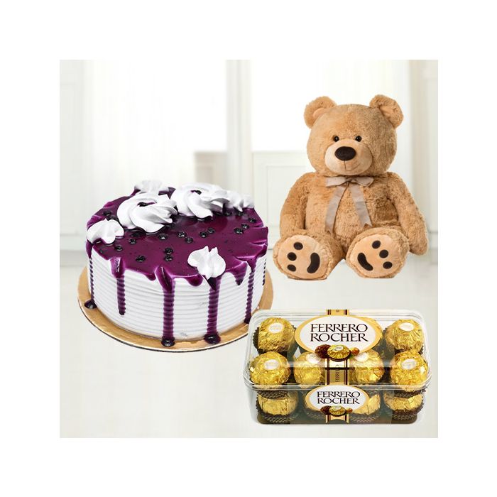Welcome to our shop! Our delicious blueberry cake with box of 16 pcs rocher ferrero chocolates with 1 feet height teddy bear is perfect for any occasion.This beautiful and delicious cake is vary moist, flavorful, and covered in a rich chocolate ganache. The blueberries add the perfect sweetness to this cake and the teddy bear is sure to bring a smile to everyone's face. This cake is perfect for Birthdays, Anniversaries, or any other special occasion. Order your cake today and let us help you make your next event one to remember!