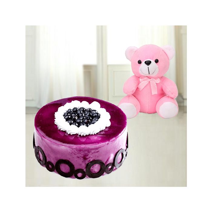 Product Description 5 | blueberry cake with 1 feet height pink colour teddy bear |