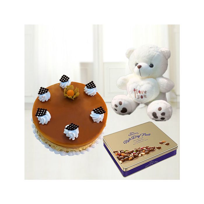 Product Description 5 | butterscotch cake with celebration buts chocolates with 6 inch white colour teddybear |