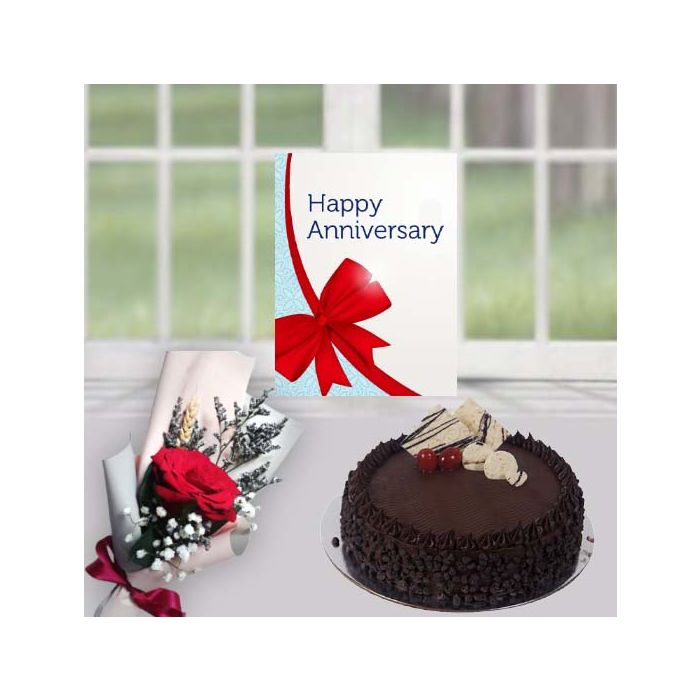 Looking for a delicious and special way to show your loved one how much you care on your anniversary? Then look no further than this decadent half kg chocolate chips cake! Made with rich and creamy chocolate, it's sure to please anyone with a sweet tooth. And what could be more romantic than a single red rose? Perfect for an unforgettable anniversary celebration!