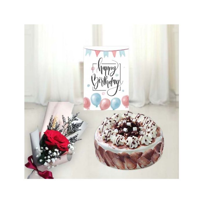 Welcome to our delicious half kg choco chips cake, single red rose, and birthday card! This beautiful and delicious cake is perfect for any special occasion, including birthdays, anniversaries, or simply to show someone you care. Our choco chips cake is made with only the finest ingredients, including rich chocolate chips, fluffy cake batter, and a creamy frosting. The single red rose is the perfect finishing touch to this stunning cake. The birthday card is also included to add a personal touch to your gift.