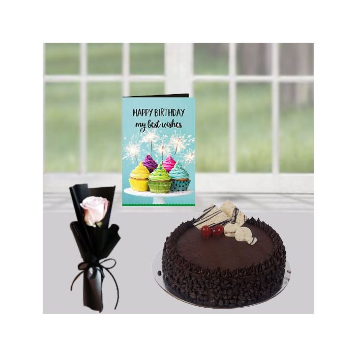 Half kg choco chips cake, single white rose, birthday greeting card