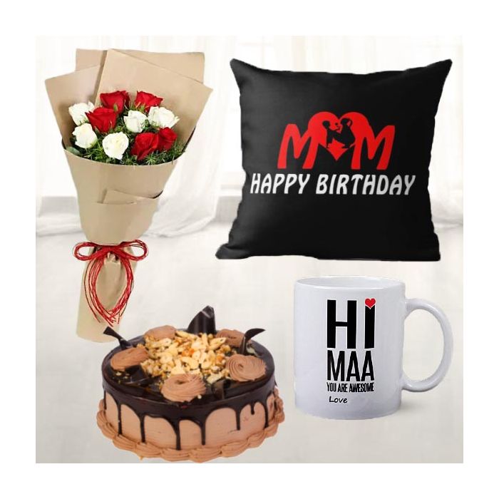 Looking for a delicious gift that will make them smile? Our half kg chocolate cake, bunch of 10 red and white roses, and photo cushion with photo mug is the perfect choice! The cake is moist and fluffy, with a rich chocolate flavor that will satisfy any sweet tooth. The roses are a beautiful addition, and the photo cushion and mug are a thoughtful way to say “I love you”.
