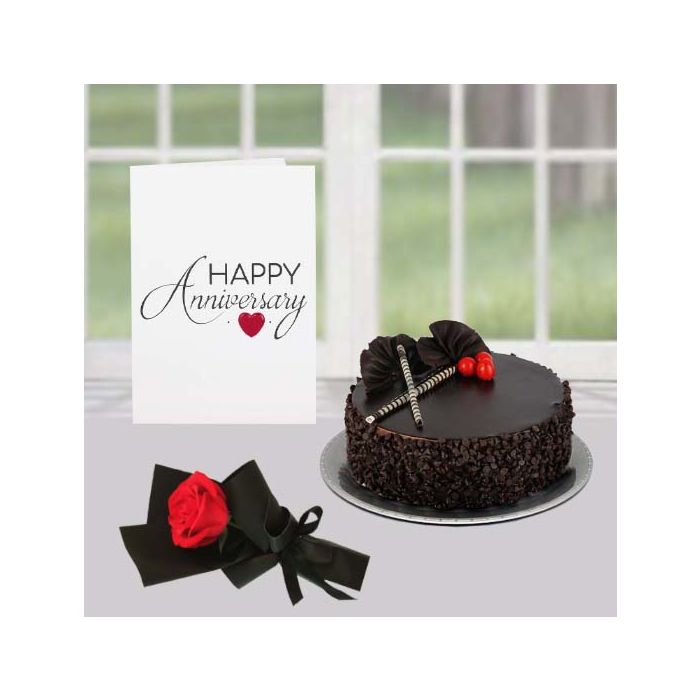 For a special anniversary celebration, get your loved one a delicious half kg chocolate cake, a single red rose, and a greeting card. They'll appreciate the thoughtfulness of this gift, and it will surely make the day even more memorable.Order now and make your anniversary one to remember!