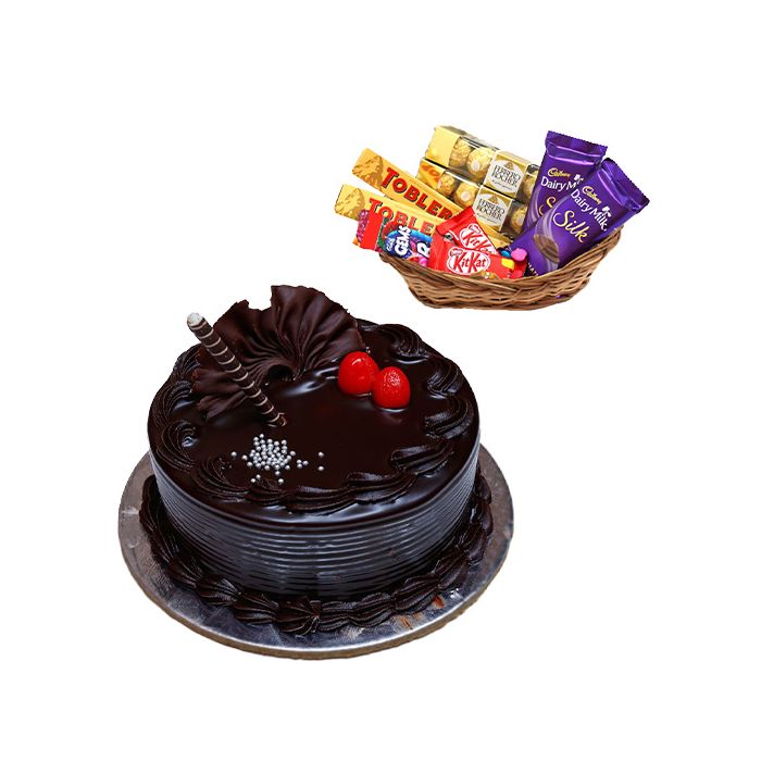 Introducing the Chocolate Fantasy Cake with Chocolate Hamper of premium chocolates. This delicious cake is made with rich chocolate and topped with a variety of decadent toppings. The perfect dessert for any occasion, this cake is sure to please everyone.The Chocolate Fantasy Cake is made with only the finest ingredients, including rich chocolate and fresh cream. The cake is then topped with a variety of delectable toppings, including chocolate chips, chopped nuts, and marshmallows. This cake is perfect for any special occasion, from birthdays to anniversaries. With its moist, fluffy texture and rich flavor, the Chocolate Fantasy Cake is sure to become a favorite.The Chocolate Hamper of premium chocolates is