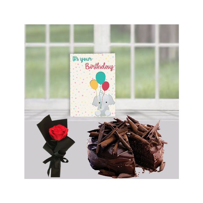 Looking for a birthday present that is both delicious and thoughtful? Look no further than this half kg chocolate truffle cool cake! This rich and moist cake is covered in a layer of luscious chocolate ganache, topped with delicate chocolate shavings. It's the perfect way to show your loved ones how much you care! In addition to the cake, this gift set also includes a single red rose and a birthday card. The rose is a symbol of love and appreciation, making it a beautiful addition to this special gift. The card allows you to write your own personal message to the birthday boy or girl. Whatever you choose to say, they are sure to appreciate the thoughtfulness of this gift!