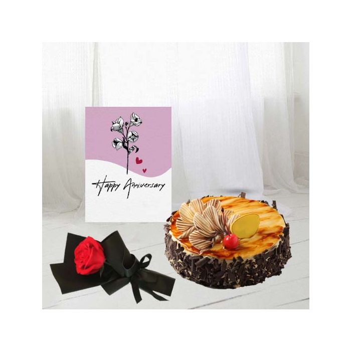 Half kg German chocolate cool cake, single red rose, anniversary card