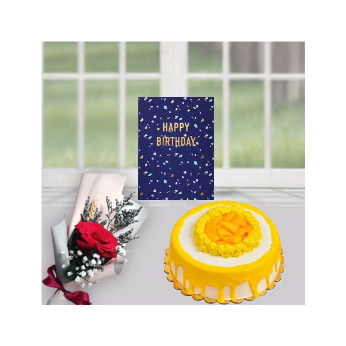 A gift that is sure to please, our half kg mango cool cake, single red rose and birthday greeting card are the perfect present for anyone celebrating a special occasion. The succulent mango cake is covered in a deliciously smooth icing, with a single red rose adding a touch of elegance. The birthday greeting card is the finishing touch to this perfect present.