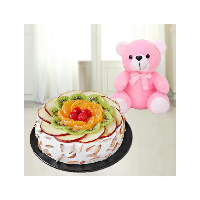 Product Description 5 | mix fruit cake with 8 inch pink colour teddy bear |