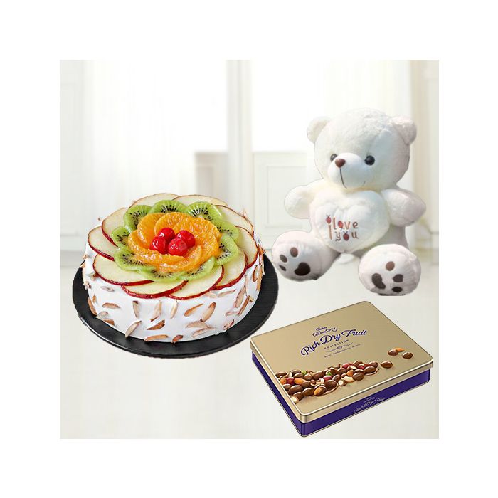 mix fruit premium quality fresh cream cake with box of cadburys pemium chocolate with 6 inch white teddy bear